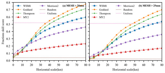 The fraction skill score (FSS) of (a) MESH > 20 mm and (b) MESH > 25 mm simulated by WRF using five different microphysics schemes.
