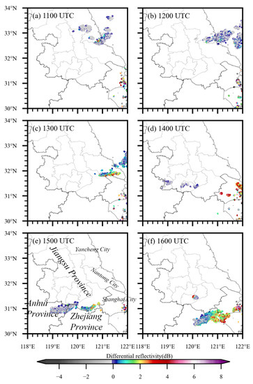 Figure 12 presents the differential reflectivity fields derived from Shanghai Nanhui dual-polarization radar observations at a 0.5° elevation angle during 1100 UTC to 1600 UTC when the cross-correlation coefficient was greater than 0.8 and basic reflectivity was over 40 dBZ. The 0.5° elevation angle was selected because we concern hailfalls at the low level and near the ground. Basic reflectivity below 40 dBZ was excluded in order to examine the large particles. A correlation coefficient below 0.8 was excluded to eliminate some clutters, although some clutters still existed near the radar. At 1100–1200 UTC, differential reflectivity was close to 0 in the coastal area of Jiangsu, indicating that the hailstorm was affecting Yancheng and Nantong city from the north to the south with large hailfalls. At 1300 UTC, the tail associated with MCS2 began to affect Shanghai, and subsequently produced hail in the north of Shanghai. At 1400 UTC, small melting hailstones were detected in the west of Shanghai, due to the occurrence of high differential reflectivity. At the same time, the new squall line associated with MCS3 also brought hails in the southwest of Jiangsu province, and during 1500–1600 UTC, the new squall line on the west side affected the junction of provinces, producing large hailstones.