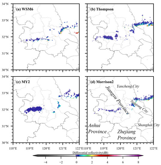 Simulated differential reflectivity (units in dB) interpolated to Nanhui 0.5° elevation for schemes in (a) WSM6, (b) Thompson, (c) MY2 and (d) Morrison2 at 1100 UTC, with a cross-correlation coefficient (CC) > 0.8 and a reflectivity > 40 dBZ.