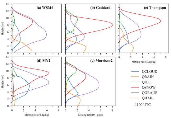 Vertical profiles of cloud hydrometeors’ mixing ratio of (a) WSM6, (b) Goddard, (c) Thompson, (d) MY2 and (e) Morrison2, averaged over the red rectangles of Figure 6.