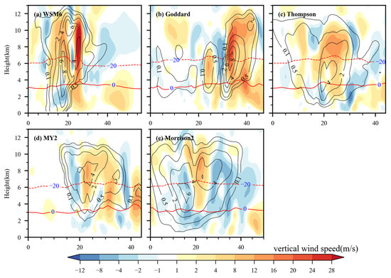 Vertical cross sections of vertical wind speed (shading, units in m/s), hail mixing ratio (black contours, units in g/kg) and height of wet bulb temperature at 0 °C and −20 °C (red lines), for the schemes of (a) WSM6, (b) Goddard, (c) Thompson, (d) MY2 and (e) Morrison2.