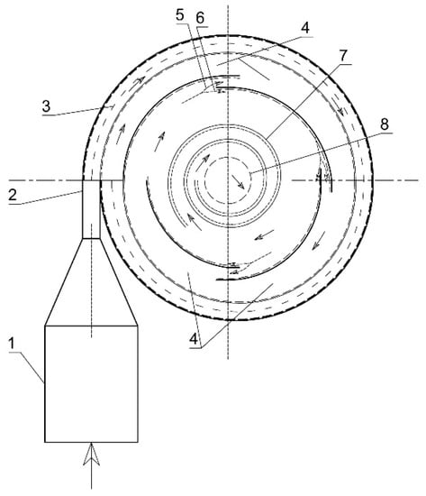 Based on the results of previous studies [,], a model of a multi-channel spiral cyclone-electrostatic filter was developed. The initial version of the mock-up was produced under laboratory conditions to study the flow characteristics of the gas flow and the fractional trapping efficiency of the particles. The main part of the device is shown in Figure 1. Only a schematic diagram of the device is provided, which describes the operation, as a European patent application is being prepared for this device, which will be submitted for consideration in the near future.