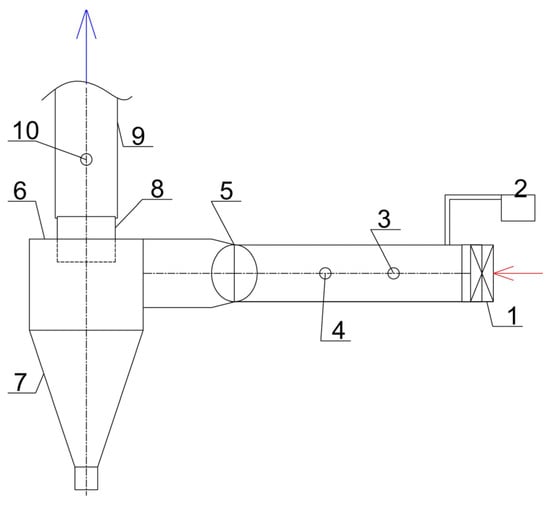 An experimental electro cyclone bench with (1) air flow fan, (2) particle dispenser, (3) air flow rate/pressure test point in the contaminated flow duct, (4) particle number concentration point in the duct, (5) duct transition to mixer, (6) cyclone-filter part of the purifier, (7) hopper of the purifier, (8) electrostatic filter part of the purifier, (9) outlet duct of the purified air, (10) test point of the air flow rate/pressure of the contaminated in the flow duct.