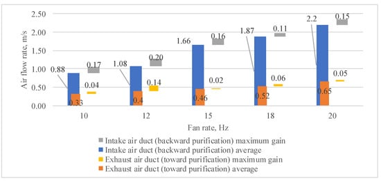 In the first stage of the investigation, studies of the aerodynamic parameters of the flows were carried out in the presence of only part of the electrostatic filter. Studies of the air flow rate generated by the installed tubular fan and the distribution of air flow rate in the duct at different fan rates (from 10 Hz to 20 Hz) were performed.