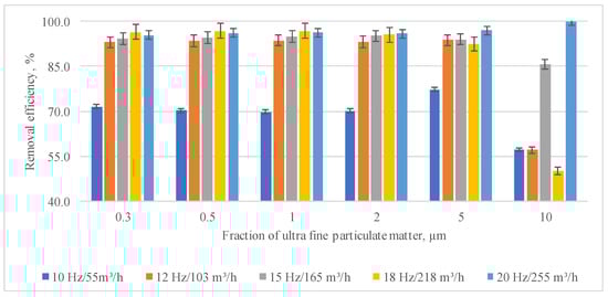 The removal efficiencies of ultrafine particulate fractions are: 0.3 µm—from 71.5% to 99.7%, 0.5 µm—from 70.3% to 96.0%, 1.0 µm—from 69.8% to 96.2%, 2.0 µm—from 70.2% to 95.1%, 5.0 µm—from 77.3% to 96.9%, 10 µm—from 57.1% to 97.2%.