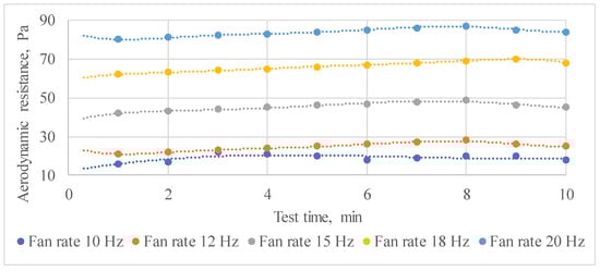 Dependence of the aerodynamic resistance of the apparatus on the fan rate during the test time rate.