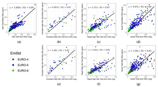 Diesel vehicle mean and maximum NOx concentration vs. total mass emissions over each test section: (a) idle test mean NOx; (b) constant high idle test mean NOx; (c) rapid high idle test mean NOx; (d) acceleration test mean NOx; (e) constant high idle test maximum NOx; (f) rapid high idle test maximum NOx; (g) acceleration test maximum NOx.