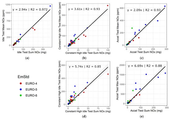 Figure 3 shows the mean and maximum NOx concentrations plotted against the total NOx mass emissions for each petrol vehicle test type. Each dot represents the results of one petrol vehicle tested. Only vehicles of Euro standard 4–6 are plotted. The correlation equations and R2 values are stated on the scatterplots. The correlation was strongest on the idle test, being slightly less strong on the high idle and acceleration tests. Only the mean NOx concentration value was used for the idle test, while for the high idle and acceleration tests, both the mean and maximum concentrations were investigated. The use of the mean value provides a stronger correlation than the maximum value on the both the high idle and the acceleration tests for these petrol vehicles.