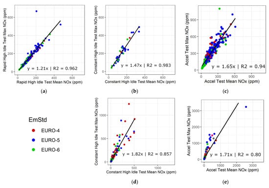 Petrol and diesel maximum NOx concentration versus mean NOx concentration for high idle and acceleration test sections: (a) diesel vehicle rapid high idle test; (b) diesel vehicle constant high idle test; (c) diesel vehicle acceleration test; (d) petrol vehicle constant high idle test; (e) petrol vehicle acceleration test.