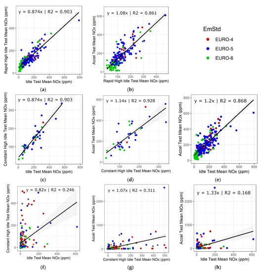 Diesel and petrol vehicle NOx concentrations compared between test types: (a) diesel vehicle rapid high idle test mean NOx versus idle test mean NOx; (b) diesel vehicle rapid high idle test mean NOx versus acceleration test mean NOx; (c) diesel vehicle constant high idle test mean NOx versus idle test mean NOx; (d) diesel vehicle constant high idle test mean NOx versus acceleration test mean NOx; (e) diesel vehicle acceleration test mean NOx versus idle test mean NOx; (f) petrol vehicle constant high idle test mean NOx versus mean idle test NOx; (g) petrol vehicle constant high idle test mean NOx versus acceleration test mean NOx; (h) petrol vehicle acceleration test mean NOx versus idle test mean NOx.