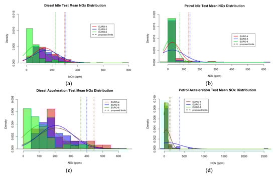 Section 3.3. summarises the mean emission concentrations for both diesel and petrol vehicles of Euro standards 4–6 for each test type. The first and second standard deviations of the distributions from these mean values are also presented, as well as the 95th percentile. The 95th percentile of each Euro standard–fuel–test type combination was then selected as the NOx PTI pass/fail threshold for that vehicle-test type as suggested by Fernández et al. [8]. If 5% of vehicles are to fail the PTI test, then on a high idle test of the type described in the current work, diesel Euro 4, 5, and 6 vehicles on a free acceleration style high idle test can have NOx concentration thresholds of 240 ppm, 234 ppm, and 228 ppm, respectively. Diesel Euro 4, 5, and 6 vehicles on a constant engine speed (i.e., the CO PTI style) high idle test can have NOx concentration thresholds of 228 ppm, 312 ppm, and 186 ppm, respectively, while petrol Euro 4, 5, and 6 vehicles on this test type can have NOx concentration thresholds of 392 ppm, 220 ppm, and 138 ppm, respectively. On an acceleration test of the dynamic properties described above, diesel Euro 4, 5, and 6 vehicles can have NOx concentration thresholds of 445 ppm, 400 ppm, and 362 ppm, respectively, while petrol Euro 4, 5, and 6 vehicles can have NOx thresholds of 163 ppm, 387 ppm, and 132 ppm, respectively. As expected, we see that the thresholds for Euro 6 are lower than Euro 4 and 5. Euro 5 and 6 have mixed relative positions depending on the test type, an indication of the issues with Euro 5 vehicles not fulfilling the emissions performance aspirations of the type approval standards partly due to the Dieselgate scandal. The large differences between thresholds for various fuel type and Euro standards calculated from these data indicate that the suggestion to perform the analysis for individual fuel types and Euro standards in the SET II project final report [10] and López et al. [25] was appropriate, and leads to more suitable thresholds for the different vehicle types.