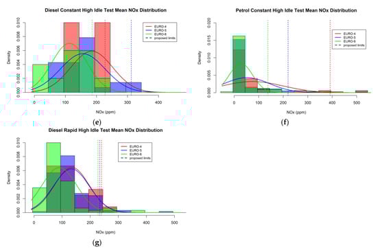 Diesel and petrol probability density distribution histograms for different test types, distributed into separate Euro standards (red bars—Euro 4, blue bars—Euro 5, green bars—Euro 6; colours are translucent to allow visualisation of all three Euro standards simultaneously), with 5% fail rate (i.e., 95th percentile) thresholds for each Euro standard marked by dashed lines: (a) diesel idle test; (b) petrol vehicle idle test; (c) diesel vehicle acceleration test; (d) petrol vehicle acceleration test; (e) diesel vehicle constant high idle test; (f) petrol vehicle constant high idle test; (g) diesel vehicle rapid high idle test.