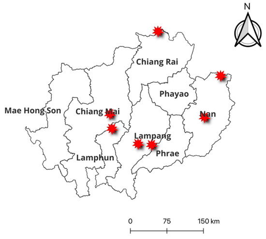 Map of northern Thailand demonstrating the monitoring stations (red stars).