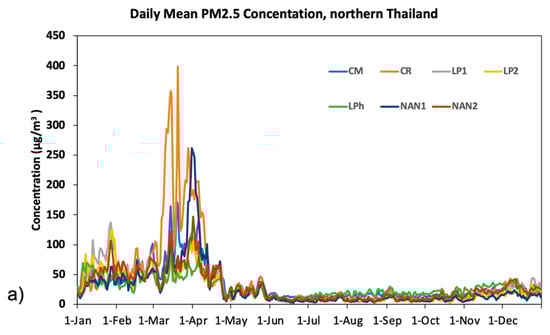 Figure 2 illustrates the daily PM2.5 concentrations in five provinces, including Chiang Mai, Chiang Rai, Lampang, Lamphun, and Nan in northern Thailand in 2020. The daily average of PM2.5 concentrations was higher than both Thailand’s and the USEPA’s guidelines, particularly from January to May. The highest levels of PM2.5 concentrations were found largely from March to April. The seasonal changes in emissions in this region are very certainly influenced by biomass burning [14,32]. When the PM2.5 in the dry season (February and March) are investigated, the highest range of PM2.5 concentration is revealed to be in the range of 100–200 µg/m3. The high particulate pollution during dry season is likely due to extensive biomass burning from agricultural burning in preparation for rice planting season. Along with the long-range transport of air pollutants from neighboring countries such as Laos, Vietnam, and Burma induced by meteorological conditions, these factors contribute to the air pollution problem in northern Thailand [8].