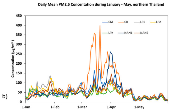 Daily mean observed PM2.5 concentrations at seven location sites in northern Thailand, (a) for the entire year 2020 and (b) during January and May 2020.