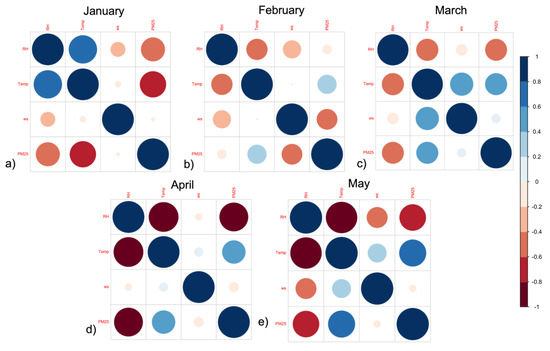 Corrplot for the monthly PM2.5, and meteorological variables in (a) January, (b) February, (c) March, (d) April, and (e) May 2020 in northern Thailand.