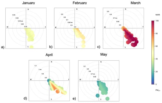 Polar plots of monthly concentrations of PM2.5 in (a) January, (b) February, (c) March, (d) April, and (e) May 2020 in northern Thailand.