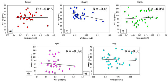 The association between PM2.5 and wind speed in (a) January, (b) February, (c) March, (d) April, and (e) May 2020.