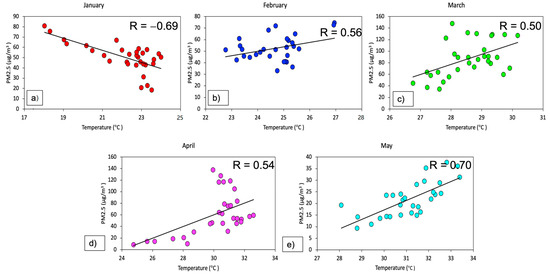 The association between PM2.5 and temperature in (a) January, (b) February, (c) March, (d) April, and (e) May 2020.