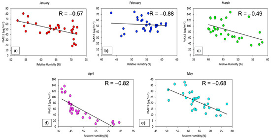 The linear regression analysis between PM2.5 and meteorological variables is also shown in Figure 5, Figure 6 and Figure 7. Figure 5 demonstrates a mainly negative relationship between wind speed and PM2.5 from January to May. These results are similar to previous studies, such as those by Wang and Ogawa [35], Ren et al. [36], and Sirithian et al. [37]. In general, the relative humidity and temperature were strongly correlated with the PM2.5 concentration; in contrast, the wind speed was slightly correlated with the PM2.5 concentration in northern Thailand. In cases where the wind speed is modest, pollutants could be blown away within a particular geographical area, but if the wind speed is strong, the huge amounts of pollutants could be transported from a long distance away. Between January and May, Figure 6 depicts the positive connection between temperature and PM2.5. This result is similar to findings observed by Zhang et al. [38] and Han et al. [39]. Except for January, when a high negative correlation is observed, PM2.5 shows a mostly strong positive relationship with temperature during the rest of the months. This is due to the fact that temperature influences particle formation; hence, a high temperature increases the photochemical reaction between precursors, whilst a low temperature might delay the process and contribute to PM2.5. The linear correlation between PM2.5 concentration and relative humidity is depicted in Figure 7. During most months, PM2.5 has a strong inverse relationship with relative humidity, similar to findings by Liu et al. [40]. Positive correlations were found in February, although the correlation coefficient is relatively low. When the humidity exceeds 70% in April and May, PM2.5 concentration shows a strong negative correlation with relative humidity. The Pearson correlation coefficient also highlights the relationships between PM2.5 and meteorological variables. There is a strong negative correlation between PM2.5 and relative humidity ranging between −0.88 and −0.49 and a weak correlation between PM2.5 and wind speed ranging between −0.096 and 0.087, as well as a positive correlation related to temperature ranging between 0.56 and 0.70. According to the findings, an increase in surface temperature and a reduction in relative humidity during the summer season had a significant impact on PM2.5 concentrations in northern Thailand.