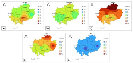 Spatial distribution of monthly averaged PM2.5 concentration (μg/m3) in (a) January, (b) February, (c) March, (d) April, and (e) May in the year 2020.