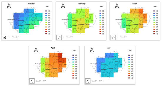 Figure 8 and Figure 9 show the spatial distribution of PM2.5 (Figure 6) and aerosol optical depth (Figure 7). In general, the levels of PM2.5 concentrations were in the range of 16 to 195 µg/m3 from January to May 2020. In January, the highest distribution of PM2.5 concentrations was found in Lampang province, ranging from 150 to 195 µg/m3, while a range of 61 to 106 µg/m3 was found in the bulk of provinces. In February, the distribution of PM2.5 concentrations in Chiang Rai province reached 195 µg/m3 at the top of the area. At the same time, PM2.5 concentrations were in the range of 106–150 µg/m3 in the rest of northern Thailand. In March, the PM2.5 concentrations were lower than in February, excluding the upper part of Chiang Rai province. In April, the PM2.5 was more evenly distributed than it was in March in the entire region, with the concentration ranging from 106 to 195 µg/m3 in most of the region. In May, the PM2.5 concentrations were similar to April, except the highest concentration was found in Chiang Mai province. The results of AOD from MERRA in Figure 4 correspond to the PM2.5 concentration in Figure 3. AOD was generally in the range of 0.1 to 0.9 from January to April. In January, AOD was not too high for the whole region, while it tended to increase in February, reaching 0.6 in Lampang, Chiang Rai, and Phayao provinces. In March, AOD increased by 0.7 in many provinces, such as Chiang Rai, Phayao, Nan, and Phrae. In April, AOD was extremely high in most areas including Chiang Rai, Phayao, Nan, Phrae, Lampang, and Chiang Mai, ranging from 0.7 to 0.9.