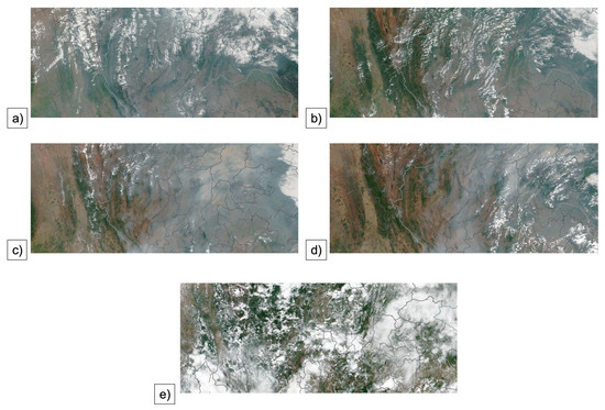 Satellite image from VIIR S-NPP corrected reflectance (true color) in (a) January, (b) February, (c) March, (d) April, and (e) May 2020 over northern Thailand.