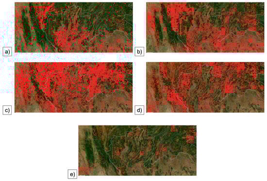 Satellite image from VIIRS (SUOMI NPP AND NOAA-20) in (a) January, (b) February, (c) March, (d) April, and (e) May 2020 over northern Thailand.