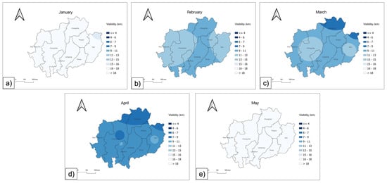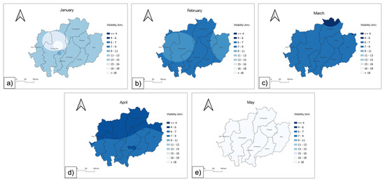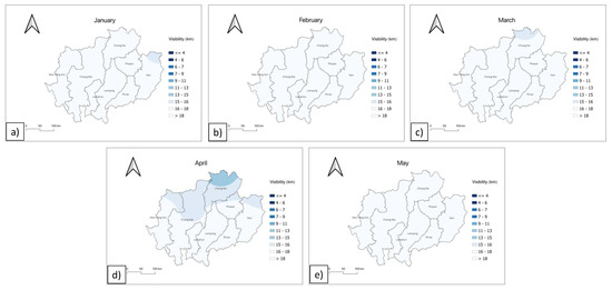 Spatial distribution of monthly averaged visibility at 1 km in (a) January, (b) February, (c) March, (d) April, and (e) May in the year 2020.