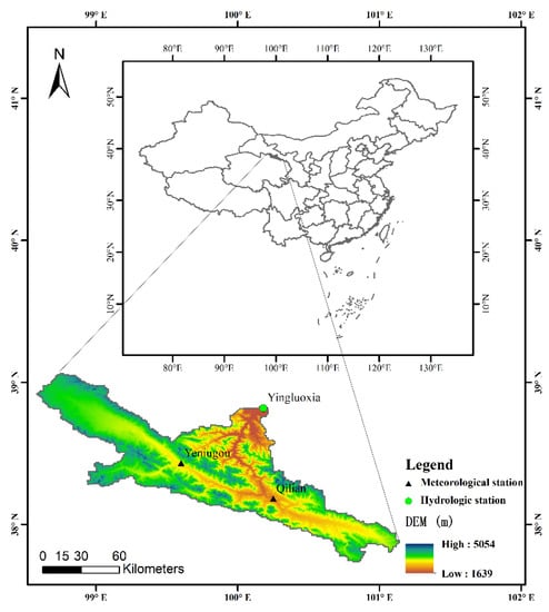 The Heihe River basin (HRB) is the second largest inland river basin in northwest China. Water scarcity is one of the critical problems that the basin has to face. Under warming climate conditions, the total runoff over the upper stream has been observed to increase over the past 60 years (1958–2014) [1]. It increased by 30.5% during the period from 1964 to 2013 [2] and by 6.1 mm per decade during the period from 1980 to 2010 [3]. Meanwhile, the levels of extreme runoff have also changed. For example, flood events in the upper catchment have increased, while low-water events have decreased [4,5]. Specifically, from 1960 to 2014, Cheng et al. (2020) found that extreme floods in the upstream areas showed an increasing trend, whereas the extremely low water showed a decreasing trend [4]. Such changes in runoff extremes necessitate changes in local water resources management, flood control, and disaster reduction strategies.