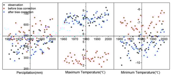 As shown in Figure 2 and Figure 3, the bias-corrected data are much closer to the observations than the uncorrected data. The multi-year average relative errors of the maximum and minimum temperatures decrease substantially from 64% and 16% to less than 1% after bias correction. The bias-corrected precipitation data are also more consistent with the observations than the uncorrected data. The multi-year average relative error decreases from 23% to 3%, indicating the advantage of bias correction.