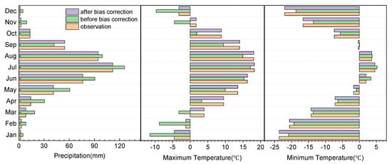 Many precipitation values are overestimated (Figure 2). The interannual distribution shows that the values are overestimated in ten out of twelve months (except for September and October), and only the data for September are underestimated (Figure 3). At the seasonal scale, the multi-year average spring precipitation is 110.31 mm, which is overestimated by nearly 73%, and the multi-year average summer precipitation is 316.07 mm, which is overestimated by 12%. The maximum temperature is underestimated (about 5 °C on average), and the minimum temperature is overestimated (about 1.5 °C on average) (Figure 2). At the inter-annual scale, only the maximum temperature in June and July exhibits a good fit with the observations, whereas the data in the other months are substantially underestimated. The minimum temperature shows a good fit with the observations only in July and August, whereas the data are overestimated in the other months.