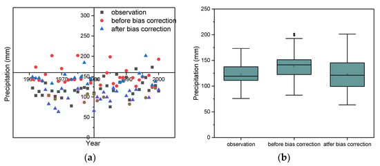 The performance of the bias-corrected GCM in reproducing the extreme precipitation at monthly scales (maximum monthly precipitation) is shown in Figure 4. Figure 4a indicates that the extreme precipitation data derived from the GCM is generally consistent with the observations, whereas the values are overestimated in some years (e.g., 1967, 1975, and 1985). The multi-year average value (denoted by “□” in the box plot) is overestimated by 13% (Figure 4b). After bias correction, the data are more consistent with the observations, and the errors of the mean, median, and 75% quantile decrease from 13%, 18%, and 10% to 0.5%, 1.7%, and 5.3%. This result demonstrates that the performance of the bias-corrected GCM in reproducing the extreme monthly precipitation was satisfactory.