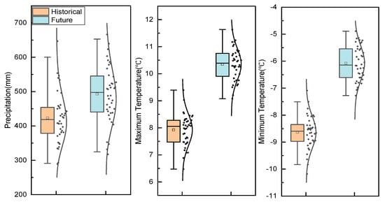 - The temperature and precipitation were projected to increase in the future. The minimum and maximum temperatures were predicted to increase by 2.4 °C and 2.6 °C compared with the baseline period (1961–2000). The precipitation was projected to increase by 16.5%, with the largest increases exceeding 50% in January, May, and December and decreases of 5% in September and October.