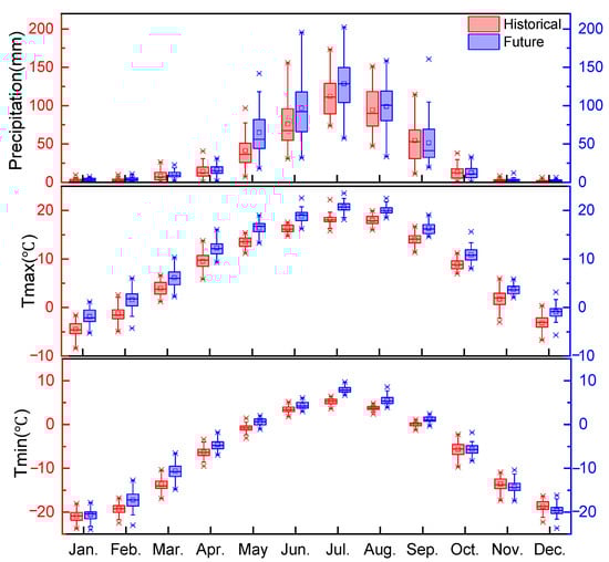 The historical and future temperature and precipitation values derived from the CSIRO-Mk3-6-0 model after bias correction are presented in the box plot in Figure 5, showing the mean, median, upper and lower quartiles, upper and lower limits, and point fitting results. The mean, maximum, and minimum temperatures and the upper and lower quartiles and limits are higher in the future than historically (1961–2000). The maximum and minimum temperatures are projected to increase by 2.4 °C and 2.6 °C, respectively, on average. At the inter-annual scale, both temperatures are projected to rise in nearly all months (Figure 6). The minimum temperature in March exhibits the largest increase (about 3.0 °C), followed by February, April, May, July, and August, with increases of more than 1.0 °C. The maximum temperature of each month is projected to rise steadily, with increases of more than 2 °C in ten out of twelve months and less than 2 °C in October and November. These results indicate that the temperature rise will continue in the coming decades, consistent with global climate warming.