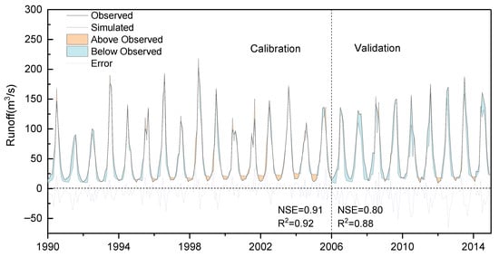 Comparison of observed and simulated monthly runoff during the calibration and validation periods.