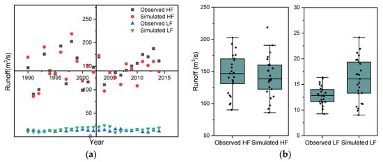 Comparisons of observed and simulated high flows and low flows. (a) is a scatter plot, and (b) is a box plot.
