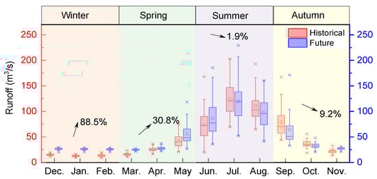 Figure 10 shows the inter-annual variability of the projected runoff. Similar to the baseline period, the largest projected runoff will occur in summer (49%), followed by autumn (20%), spring (18%), and winter (13%). The projected runoff differs in different seasons and months and is expected to increase or decrease compared to the baseline period. It is projected to increase the most in winter (88.5%), followed by spring (30.8%). However, the runoff is predicted to decrease in some months in summer and autumn (September, October, July, and August). The greatest decrease is projected to occur in September (18%), which may be caused by the lower precipitation in this month, as shown in Figure 6.