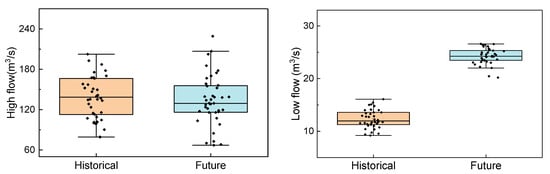 The projected runoff extremes are also considered since they are more sensitive to climate change at the regional scale. Figure 11 and Table 4 show the statistical results of the projected high- and low-flow series. The mean value of the high-flow series is projected to decrease slightly by 3%, the maximum value (229.3 m3/s) is predicted to increase by 13%, and the minimum value (67.15 m3/s) is predicted to decrease by 15%. The coefficient of variation is projected to increase by 27%, indicating an increase in the degree of variation of the high flows. The data suggest an increased flood risk during the wet season, resulting in challenges in water resource allocation and management.