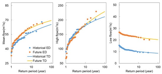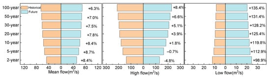 Compared to the baseline period, the return levels of the high flows are expected to increase over a 10-year return period, with 3.9%, 5.1%, 6.6%, and 8.4% increases in the 20-year, 30-year, 50-year, and 100-year return periods (Figure 13), respectively, suggesting that the high flows will be more extreme, i.e., for a given return level of high flows, the return period will become shorter. For instance, the return period for a 200 m3/s high flow was 37 years during the historical period and will be 21 years in the future. These results indicate that this area will experience more flooding in the future, resulting in increased challenges related to local flood control.