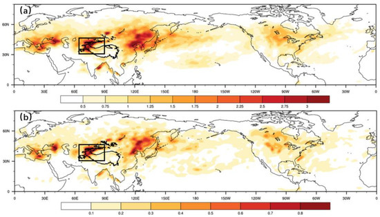 The Rossby wave (RW) propagation caused by external forcing is one of the mechanisms leading to the configuration of wave trains called teleconnection. In the northern hemisphere (NH), a favorable area with RW-forming dynamic conditions is located in East Asia [1,2]. The Rossby wave pattern at the upper troposphere generally manifests as Rossby wave train of atmospheric response to one or more local wave sources [3,4,5]. In the NH midlatitudes, the source of RW may be related to topography, marine–terrestrial contrast, or transient baroclinic systems [6]. Ye and Zhu [7] believe that both topographic and diabatic heating play an important role in the climatological atmospheric teleconnections along the westerly jet stream, especially the large troughs over East Asia and the east coast of North America. Previous studies of Rossby wave source (RWS) have shown that most of the strong RWS are located in the subtropical zone on the seasonal timescales, although most of the upper divergent flow regions are located near the equator. Because the divergent flow is greater at the edge of the greatest divergence zone and the absolute vorticity gradient is larger at higher latitudes [2,8,9], these all provide conditions for RWS formation in the subtropics. Therefore, RWS may be associated with both local forcing and absolute vorticity advection caused by atmospheric diabatic heating. Plumb [10] shows that the main forcing of the quasi-stationary wave originates from the topographic influence over the Tibetan Plateau (TP), as well as interaction of the diabatic heating with transient flows over the Pacific, Northwest Atlantic, and Siberia by diagnosing the wave activity flux in the NH winter.