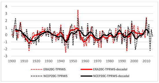 The standardized time series of Rossby wave source over the TP (*−1; dotted lines) and its 10−year low−pass filtering value (solid lines) in summer of 1900−2010. The red and black lines are results from the ERA−20C and NCEP−20C reanalysis datasets, respectively. The RWS*−1 represents the intensity of negative Rossby wave source over the TP.