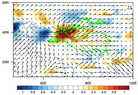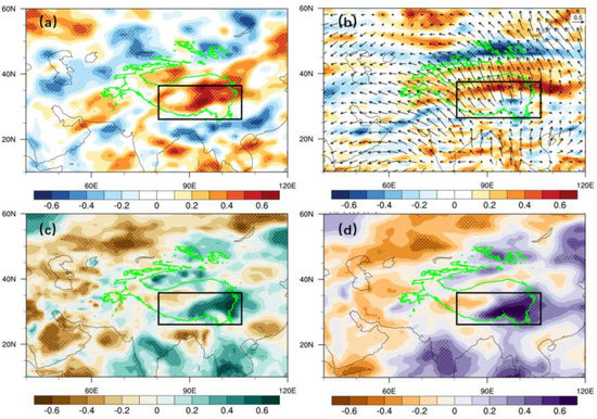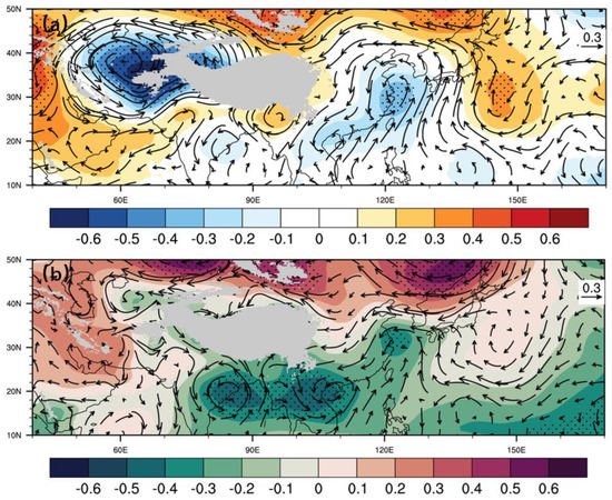 In order to reveal the causes of the close relationship between TP-RWS and precipitation in East Asia, the Asia–Pacific atmospheric circulation anomaly associated with the TP-RWS is further discussed and analyzed in this study. As shown in Figure 10, significant negative geopotential height anomalies are observed at the middle and low troposphere over northwestern TP, Huang-huai River Basin, and the southern part of Japan, while positive geopotential heights appear over the southeastern TP and the northwestern Pacific Ocean. The stream function field at 850 hPa in the southern TP and East Asia is dominated by anomalous cyclonic circulation, and the centers are located in eastern India and Bangladesh, the Indochina Peninsula, and the Huang-huai River Basin. The prevailing southerly and easterly winds in the northwestern Pacific Ocean and the Huang-huai River Basin are attributed to the anomalous cyclonic circulation at the lower troposphere in East Asia, which lead to the water vapor convergence and upward movement at the middle and lower troposphere. The above circulation pattern provides favorable water vapor transmission and dynamic conditions for the occurrence of precipitation in these regions, which increase the precipitation in the Huang-huai River Basin, South Korea, and Japan.