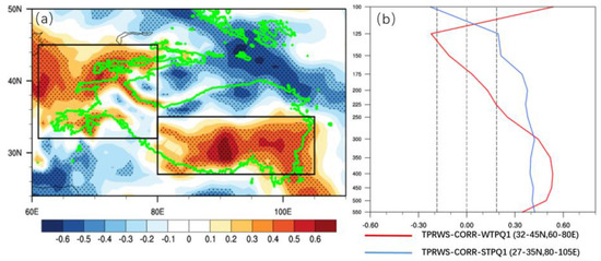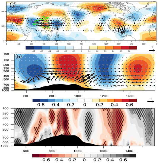Since the large-scale divergent flow is directly related to anomalous diabatic heating of the atmosphere, we calculate the correlation map of the atmospheric heat source (Q1) with the TP-RWS in order to explore the possible causes of the TP-RWS interdecadal variations (Figure 5). It is worth noting that two Q1 key areas occur over the plateau, which are located in the northwestern TP (Pamirs plateau) and southeastern TP. When the interdecadal TP-RWS intensifies, the atmospheric heating characteristics over the two regions are significantly different, that is, the anomalous Q1 in northwestern TP is mainly found between the near-ground plateau and 300 hPa in the troposphere, while the Q1 in southeastern TP is more pronounced from 500 hPa to 200 hPa. The regional climate of Pamir Plateau and Tarim Basin are mainly characterized by drought, with less rainfall due to the faint water vapor imported from the tropical Indian Ocean. Meanwhile, the giant mountains in southeastern TP are mainly affected by the monsoon and moist water vapor from the tropical ocean in summer, resulting in abundant water vapor being lifted here, which is conducive to the occurrence of deep convection [49,50]. Therefore, dynamical mechanisms contributing to the interdecadal variations in TP-RWS may be different in northwestern and southeastern TP.
