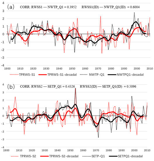 The standardized interannual and interdecadal time series of TP−RWS components (*−1; red lines) and the Q1 over the northwestern and southeastern TP (black lines) in summer of 1900−2010. (a) The vortex stretching term RWS−S1 and the northwestern TP−Q1 (60–80° E, 32–45° N), (b) the absolute vorticity advection term RWS−S2 and the southeastern TP-Q1 (80–105° E, 27–35° N).