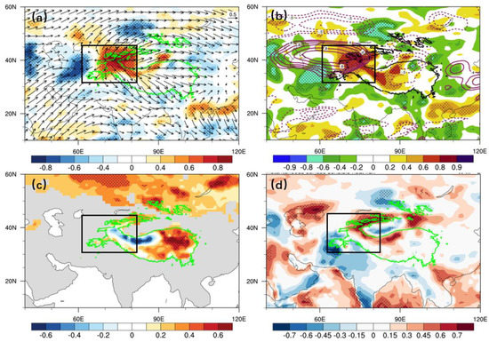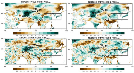 The correlation coefficients between interdecadal TP−RWS (same as Figure 3) and global terrestrial precipitation. The interdecadal TP−RWS in (a,c) and (b,d) are from ERA−20CR and NCEP−20C, respectively. The precipitation data in (a,b) and (c,d) are from CRU_ts4 and GPCC, respectively. The cross−hatched areas indicate coefficients above the 95% confidence level. Black boxes indicate the key areas of interdecadal precipitation.