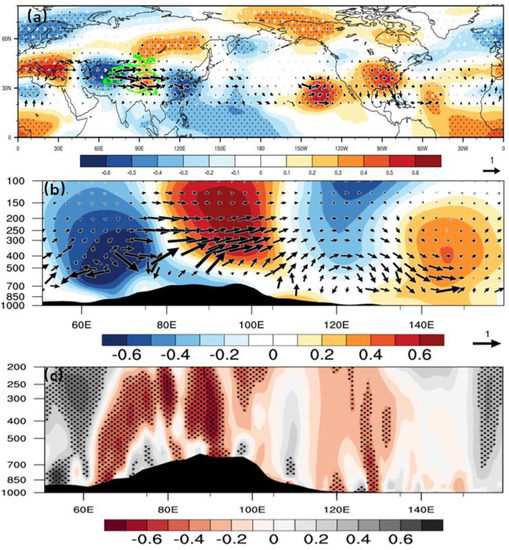 Previous studies have shown that the Atlantic multidecadal oscillation (AMO) can modulate the intensity of the East Asian summer monsoon by exciting teleconnection wave train [53,54,55,56]. The interannual variation in deep convection in the southeastern TP is also closely associated with the AMO [57,58]. In order to distinguish the effects of TP-RWS and AMO on East Asia, we calculate the partial correlation between interdecadal TP-RWS and the atmospheric circulation without AMO series in the Northern Hemisphere (Figure 12). Consistent with Figure 11, the zonal wave train excited by interdecadal TP-RWS propagating from northwestern TP to East Asia is still clear and the corresponding circulation intensity over East Asia and Northwest Pacific is significantly strengthened. Therefore, it is reasonable to believe that the TP-RWS during 1900 to 2010 can stimulate an equivalent barotropic zonal wave train that travels eastward along the westerly jet to the northwest Pacific and exhibits “low-high-low-high” geopotential height anomalies at the vertical profile. Furthermore, the pattern is conducive to the upward movement and precipitation over the Huang-huai River Basin.