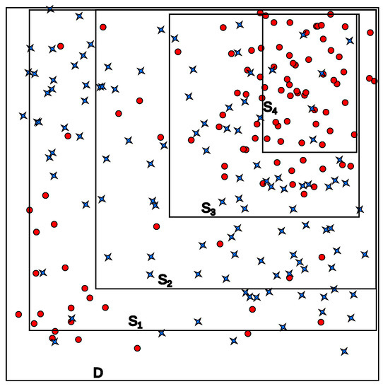 The peeling stage is summarized in Figure 1, where D is the set of data, are the subsets obtained in several iterations, and our objective is to classify the red points; that is, defines the split in red data (inside the subset) and blue data (outside the subset).