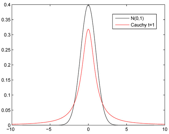 Figure 2. Illustration of the Cauchy mutation versus Gaussian mutation. - Differential evolution operators (DE): The differential evolution operator is inspired on the homologous evolutionary algorithm [53]. DE creates new larvae by perturbing the population, applying a difference operator over the individuals. The applied difference operator for introducing the perturbations is expressed as follows:where F is a factor which regulates the evolution by weighting the perturbation amplitude.