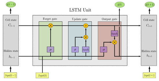 Long short-term memory (LSTM) networks constitute a specific type of RNN network that emerged to solve the vanishing gradient problem, which consists of the gradient decreasing as the number of layers increases, preventing the learning of the network when the number of RNN is relatively high. LSTM networks include an additional integrated feature, i.e., the memory cell. They use three gates (forget, update, and output) to keep longstanding relevant information and discard the irrelevant. The forget gate decides what relevant information should be saved. The update gate decides what new information to use to update the memory cell. Finally, the output gate decides which is the output value that will be the input of the next hidden unit [72]. Figure 4 shows the architecture of an LSTM unit.